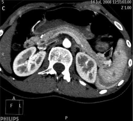 При УЗИ брюшной полости патологических изменений не выявлено. УЗИ щитовидной железы: узел размером 18×13 мм в правой доле, неоднородной структуры. Больная консультирована эндокринологом, рекомендована диагностическая пункция узла в плановом порядке после оперативного вмешательства на ПЖ. При эндоскопическом УЗИ радиальным датчиком заподозрено очаговое образование в области хвоста ПЖ до 10 мм в диаметре. МД-СКТ брюшной полости и головного мозга: гиперденсное образование по переднему контуру хвоста ПЖ размером 16×10 мм (рис. 2), Рисунок 2. Мультидетекторная спиральная компьютерная томограмма больного К. Инсулинома хвоста поджелудочной железы (стрелка). размер аденомы гипофиза 10 мм. МРТ брюшной полости: патологических изменений не выявлено.