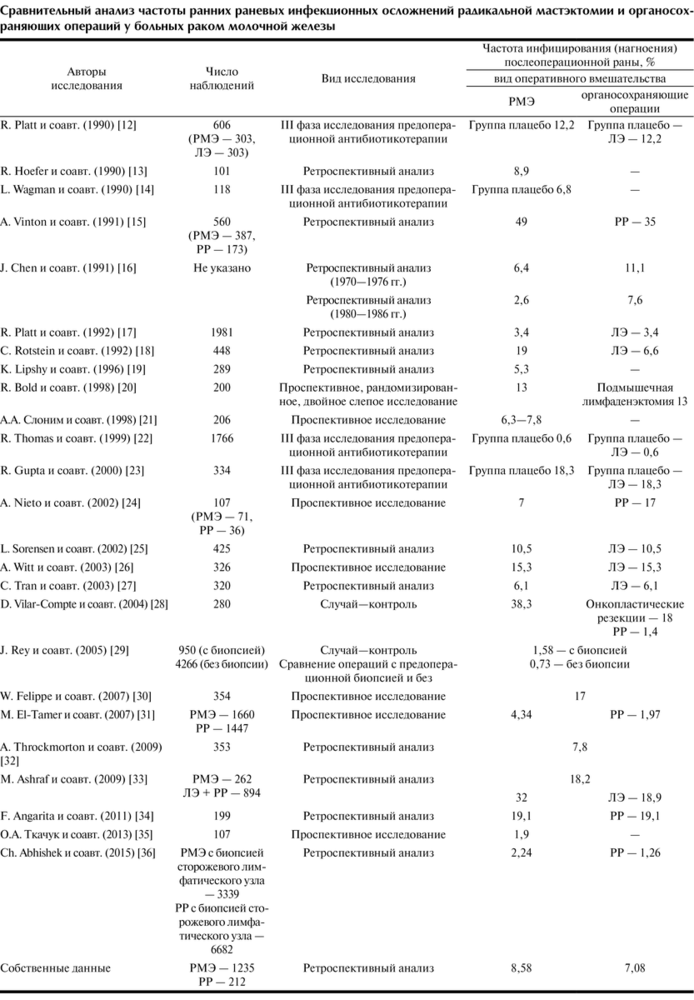 4. Сравнительному анализу частоты раневых инфекционных осложнений радикальной мастэктомии и органосохраняющих операций у больных РМЖ посвящены единичные исследования отечественных авторов.