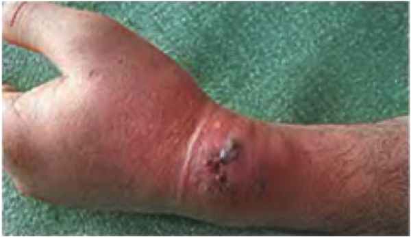 - Нагноение с последующим развитием абсцессов, флегмон — их развитию способствуют высокий уровень контаминации (загрязнения раны) и высокая вирулентность (агрессивность) попавшей в рану микрофлоры, наличие в ране инородных тел, некрозов, скоплений жидкости или крови, хроническое нарушение местного кровоснабжения, общие факторы, влияющие на течение раневого процесса, а также поздняя хирургическая обработка. Именно отказ пациента от своевременного обращения за специализированной помощью может повлечь за собой серьезные осложнения.