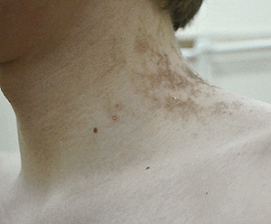 В стационаре ДКВО ГКБ №14 им. В.Г. Короленко мы наблюдали 13-летнего пациента, который, со слов матери, заболел в возрасте 6 мес. Появившееся вначале на боковой поверхности шеи розовое пятно постепенно стало коричневым, а к возрасту