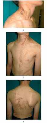 При поступлении в отделение патологический процесс на коже носил распространенный невоспалительный характер (см. рисунок). Рисунок 1. Клинические проявления эпидермального систематизированного невуса (а—в). Множественные пятнистые и узелково-бляшечные и полосовидные очаги различных очертаний локализовались преимущественно на коже боковых поверхностей шеи, плеч, в меньшей степени — на туловище, верхних и нижних конечностях. На конечностях поражения были представлены полосовидными пятнистыми высыпаниями светло-коричневого цвета с гладкой поверхностью. Мягкие бородавчатые образования светло- и темно-коричневого цвета, на несколько миллиметров возвышались над поверхностью кожи, на ощупь отмечалась выраженная сухость кожи.