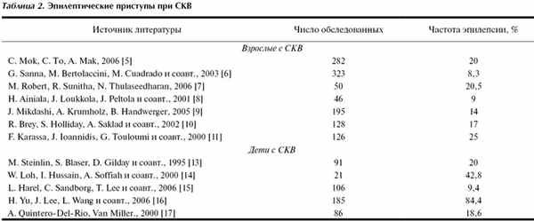 Системная красная волчанка. Эпилептические приступы рассматриваются как важное проявление неврологических синдромов при СКВ [2, 3]. По разным данным, они развиваются в 8,3-25% случаев СКВ (табл. 2) 10. Это означает, что их частота почти в 8 раз выше распространенности эпилепсии в общем населении. Так, по данным E. Kampylafka и соавт. [12], которые обследовали 370 пациентов с СКВ (средний возраст 32±14 лет, 88% женщины) и средней длительностью заболевания 9±7,8 года судороги наблюдались в 35% случаев. Все эпилептические приступы протекали по типу тонико-клонических, у 3 пациентов был эпилептический статус.