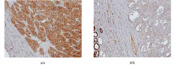 Иммуногистохимическое исследование. В клетках опухоли обнаруживается мембранно-цитоплазматическая выраженная экспрессия CD117 (клон YR145, Cell Marque) (рис. 6, а); Рис. 6. Иммунопероксидазный метод, ×200. а — клетки опухоли обнаруживают мембранно-цитоплазматическую выраженную экспрессию CD117 (клон YR145, Cell Marque); б — клетки опухоли негативны к CD10 (клон 56C6, DAKO), в то же время атрофичные почечные канальцы по периферии псевдокапсулы опухоли обнаруживают выраженную мембранно-цитоплазматическую экспрессию CD10 (клон 56C6, DAKO). клетки негативны к CD10 (клон 56C6, DAKO), в то же время в атрофичных почечных канальцах по периферии псевдокапсулы опухоли выявляется выраженная мембранно-цитоплазматическая экспрессия CD10 (клон 56C6, DAKO) (см. рис. 6, б).