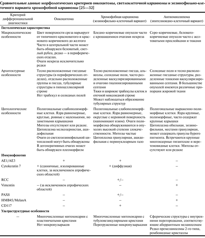Сравнительные данные морфологических критериев онкоцитомы, светлоклеточной карциномы и эозинофильно-клеточного варианта хромофобной карциномы [25—32]