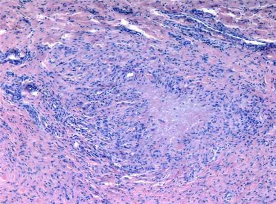 Трудности распознавания редких форм КГ сопряжены с неадекватной тактикой ведения больных, в частности, с хирургическим удалением патологических очагов. В описанном случае удаление узелковых образований в трех местах на голенях 3-летней девочке явилось тяжелой психической травмой, после которой ребенок испытывает страх перед врачами. В нескольких случаях КГ, наблюдавшихся нами ранее, врачи обычно прибегали к хирургическому удалению элементов сыпи, локализованных на голове, и у 5-летней девочки КГ была удалена вместе с клитором, на котором она располагалась. Патоморфологический анализ представленных препаратов (рис. 2): Рисунок 2. Патоморфологические изменения в операционном материале (окрашивание гематоксилином и эозином; ув. 100). в предоставленном материале — фрагменты дермы с участком подкожно-жировой ткани, эпидермис отсутствует, в фиброзированной строме обнаруживаются участки деструкции коллагеновых волокон, окруженных палисадообразным инфильтратом, преимущественно из гистиоцитов и лимфоцитов. Заключение: выявленные изменения характерны для КГ.
