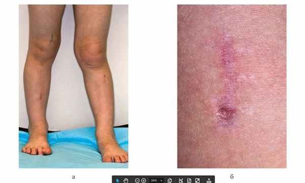 Больная П., 3 года, с диагнозом узловатая эритема направлена на консультацию в ГКБ №14 им. В.Г. Короленко. Болеет около 1 года с того момента, когда на передней поверхности голеней образовались единичные безболезненные узелки величиной с вишневую косточку. После их хирургического удаления появились новые подобные элементы (рис. 1). Рисунок 1. (а, б). Послеоперационные рубцы у девочки 3 лет с глубокой формой КГ. При обращении к хирургу с предварительным диагнозом «ушиб» направлена на рентгенологическое исследование голени в двух проекциях. Заключение: форма, контуры, структура костей обычные; костных патологических изменений не выявлено. При повторном консультировании у хирурга через 2 мес в области средней трети обеих голеней обнаружены образования до 1,5—2,0 см в диаметре, безболезненные при пальпации. Диагноз не установлен, больная направлена на консультацию к онкологу. На основании рентгенографии костей был выставлен диагноз «фиброма мягких тканей обеих голеней». При ультразвуковом исследовании мягких тканей в правой голени, в средней трети подкожно определялись образования пониженной эхогенности округлой формы, однородной структуры размером 8×5×7 мм с четкими ровными краями и овоидной формы неоднородной структуры размером 10×5×9 мм. В мягких тканях левой голени в средней трети подкожно определялось образование овоидной формы, неоднородной структуры пониженной эхогенности размером 17×9×18 мм и верхней трети — аналогичное размером 12×5×13 мм. Выдано заключение: ультразвуковые признаки опухолей.