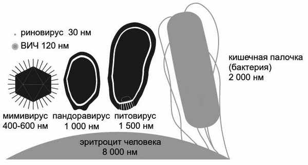 Вот это мнение и оказалось неверным. Скажем аккуратнее: не вполне верным. Потому что в 2003 году был открыт мимивирус… — гигантский вирус, который паразитирует в пресноводных амебах и создает в них «вирусные фабрики». Его вирион приближается к невероятному для вирусов размеру в 500 нанометров, то есть 0,5 микрона. Этот размер больше, чем у некоторых бактерий (среди последних есть внутриклеточные паразиты со средним размером 200–300 нанометров). Такой вирус вполне можно увидеть в световой микроскоп, а не только в электронный. И бактериальные фильтры его задерживают. Собственно говоря, поначалу мимивирусы за бактерий и приняли. Неудивительно, учитывая, что средний размер обычных вирусов — всего-то около 100 нанометров.