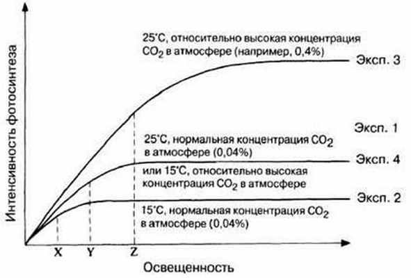 Рис. 7.20. Влияние различных факторов на интенсивность фотосинтеза.