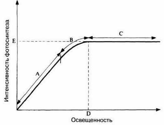 Скорость фотосинтеза возрастает линейно, или прямо пропорционально, увеличению интенсивности света. В области лимитирования светом скорость фотосинтеза не изменяется при уменьшении концентрации СО2.