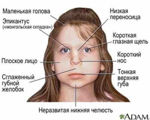 - Лицо с уменьшенными глазными щелями, коротким носом со впалой переносицей, уплощенными скулами, длинной и тонкой верхней губой.