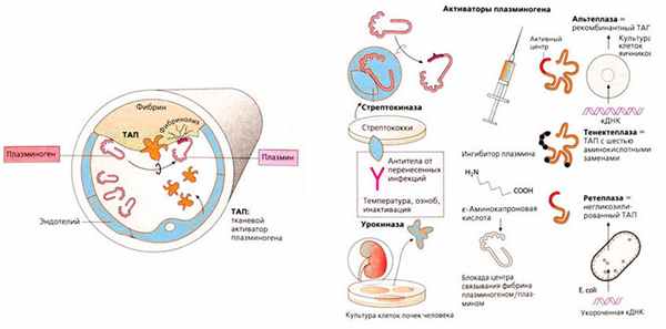 Другим фибринолитическим препаратом является тканевой активатор плазминогена, который продуцируется эндотелиальными клетками и вызывает частичный протеолиз плазминогена, превращаясь в плазмин. Обладает высоким сродством к фибрину и ускоряет в сотни раз его действие на плазминоген, причем активирует только те молекулы плазминогена, которые адсорбированы на нитях фибрина. Его действие ограничивается фибрином тромба. Попадая в кровоток, он связывается со специфическим ингибитором и поэтому мало действует на циркулирующий в крови плазминоген и в меньшей степени снижает уровень фибриногена. Для клинического использования был получен по рекомбинантной ДНК технологии синтетический препарат тканевого активатора плазминогена — Алтеплаза (Актилизе), выпускаемый в виде лиофилизированного порошка для приготовления раствора для инфузий. Препарат активируется при соединении с фибрином и стимулирует превращение плазминогена в плазмин, способствуя растворению сгустка фибрина.