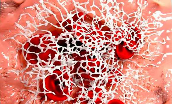 В ответ на кровотечение начинает свою работу система свертывания крови. Фибриноген – специфический белок, который вырабатывается в печени. Он отвечает за свертываемость крови, находится в сыворотке и не вызывает никаких проблем. Растворимый фибриноген свободно циркулирует в крови, обеспечивает взаимодействие сосудистой стенки с форменными элементами крови и является фактором, определяющим вязкость крови. В норме его концентрация составляет 2,0- 4,0 г/л. Фибриноген первым включается в работу, пробуя прекратить кровотечение. Для этого он под воздействием фермента тромбина сначала расщепляется на промежуточные соединения-мономеры, а затем превращается в нерастворимый полимер. Белые фибриновые нити — основная часть тромба, закрывающее дефект в сосудистой стенке.