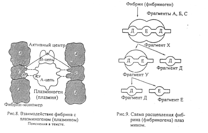 Схематично взаимодействие фибрин(оген)а с плазминогеном представлено на рисунке (рис.8). Сгустки фибрина избирательно адсорбируют и удерживают плазминоген. Последний имеется в качестве примеси и в фибриногене, но при переходе его в фибрин сродство к плазминогену сильно возрастает. Лизиновые участки (ЛУ) расположены в центральной части молекулы фибрин(оген)а — в домене Е. Взаимодействие плазминогена с фибин(оген)ом происходит за счет специфического соединения ЛСУ с ЛУ. Более сильное по сравнению с фибриногеном сродство фибрина к плазминогену указывает на то, что в молекуле фибрина ЛУ в большей степени экспонированы (выставлены на поверхность). Свойство присоединяться посредством ЛСУ к нескольким молекулам фибрина присуще и плазмину.
