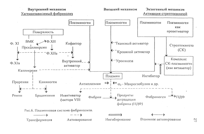 Активирование плазминогена осуществляется несколькими путями: внешним — под действием активаторов тканей, крови, сосудистой стенки, которые высвобождаются в кровь под влиянием различных факторов; внутренним — при участии свойственных крови белков — фактора Хагемана, прекалликреина, высокомолекулярного кининогена: экзогенным— введение в организм активаторов плазминогена (стрептокиназа и созданные на ее основе препараты, урокиназа, комплекс стрептокиназа — лиз-плазминоген; тканевый активатор плазмнногена, получаемый методом генной инженерии, и другие препараты) с терапевтической целью.
