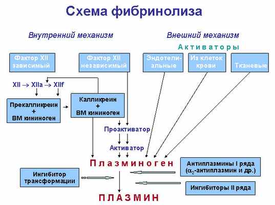 Гиперактивация фибринолиза — причина нарушения гемостаза и развития геморрагических диатезов. Избыток в крови веществ, активизирующих плазминоген, и усиленная продукция плазмина приводят к ускоренному протеолитическому расщеплению факторов свертывающей системы крови. Гидролитическое расщепление фибриногена и поражение тромбоцитарного звена гемостаза нарушают свертываемость крови и вызывают развитие фибринолитических кровотечений. Эти явления возникают при обширных травмах, тяжелых интоксикациях, операциях с экстракорпоральным кровообращением, заболеваниях крови.
