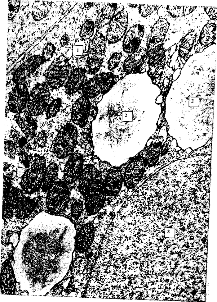 Рисунок 20 — Клетка бурой жировой ткани (увеличение в 23 000 раз): митохондрии; 2 — липидные включения; 3 — ядро