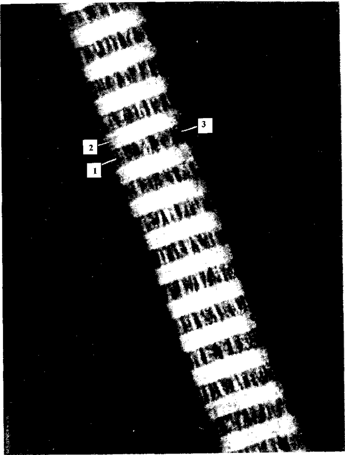 Исчерченность первичная — в пределах широких полосок видны тонкие темные линии, идущие поперек волокна. Она обусловлена различной полярностью аминокислот в молекуле тропоколлагена.