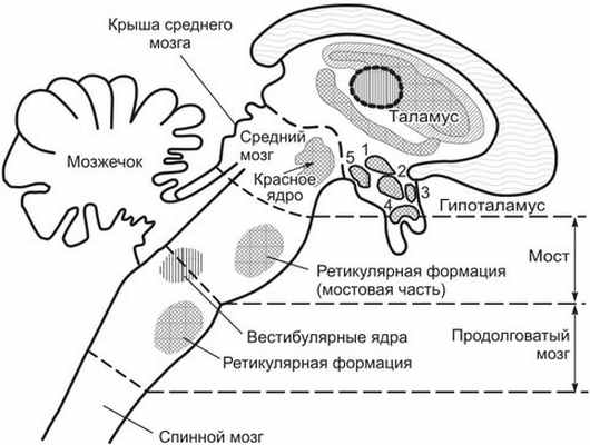 Рис. 2. Расположение некоторых ядер в стволе мозга и гипоталамусе: 1 — паравентрикулярное; 2 — дорсомедиальное: 3 — преоптическое; 4 — супраоптическое; 5 — заднее