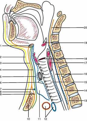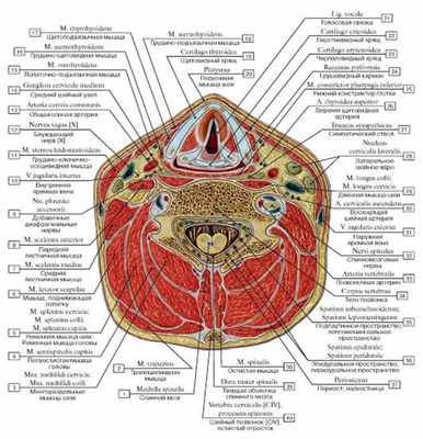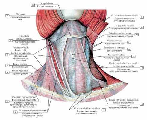 1 - os hyoideum; 2 - fascia superficialis (1-я); 3 - lamina superficialis fasciae cervicalis propriae (2-я); 4 - lamina profunda fasciae cervicalis propriae (3-я); 5 - париетальный листок fasciae endocervicalis (4-я); 6 - висцеральный листок fasciae endocervicalis (4-я) и перешеек gl. thyroidea; 7 - arcus venosus juguli; 8 - spatium interaponeuroticum; 9 - spatium suprasternale; 10 - manubrium sterni; 11 - spatium previscerale; 12 - a. et v. brachiocephalicae; 13 - spatium prevertebrale; 14 - spatium retroviscerale; 15 - trachea; 16 - oesophagus; 17 - cartilago cricoidea; 18 - rima glottica; 19 - epiglottis; 20 - fascia prevertebralis (5-я)