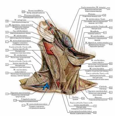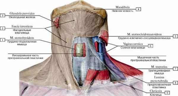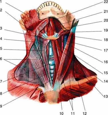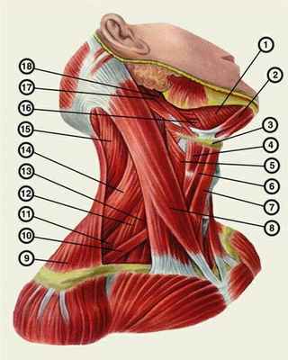 1 — челюстно-подъязычная мышца; 2 — переднее брюшко двубрюшной мышцы; 3 — подъязычная кость; 4 — щитоподъязычная мышца; 5 — нижний констриктор глотки; 6 — верхнее брюшко лопаточно-подъязычной мышцы; 7 — грудиноподъязычная мышца; 8 — грудино-ключично-сосцевидная мышца; 9 — трапециевидная мышца; 10 — нижнее брюшко лопаточно-подъязычной мышцы; 11 — задняя лестничная мышца; 12 — средняя лестничная мышца; 13 — передняя лестничная мышца; 14 — мышца, поднимающая лопатку; 15 — ременная мышца головы; 16 — подъязычно-язычная мышца; 17 — заднее брюшко двубрюшной мышцы; 18 — шилоподъязычная мышца.