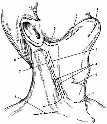 1 — подподбородочная флегмона; 2 — поднижнечелюстная флегмона; 3 — окологлоточный абсцесс; 4, 5 — флегмона сосудистого влагалища в нижнем (4) и верхнем (5) отделах; 6 — разрез по Кютнеру; 7 — разрез по де Кервену; 8 — флегмона бокового треугольника шеи; 9 — предтрахеальная флегмона и гнойный струмит; 10 — надгрудинная межапоневротическая флегмон