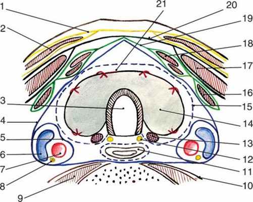 Поперечный срез шеи на уровне щитовидной железы (схема): 1 - поверхностная фасция шеи (1-я); 2 - platysma; 3 - trachea; 4 - париетальный листок внутренностной фасции шеи (4-я); 5 - vagina carotica; 6 - v. jugularis interna; 7 - a. carotis communis; 8 - n. vagus; 9 - предпозвоночные мышцы; 10 - предпозвоночная фасция (5-я); 11 - oesophagus с висцеральным листком внутренностной фасции шеи (4-я); 12 - n. laryngeus recurrens; 13 - gl. parathyroidea; 14 - gl. thyroidea; 15 - висцеральная капсула щитовидной железы (4-я); 16 - m. omohyoideus; 17 - m. sternocleidomastoideus; 18 - m. sternohyoideus; 19 - предтрахеальная фасция (3-я); 20 - поверхностный листок собственной фасции шеи (2-я); 21 - фиброзная капсула щитовидной железы