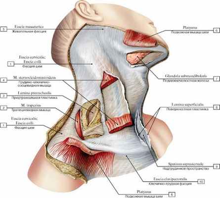 В переднем отделе шеи мышцы и фасции располагаются в несколько слоев, ограничивая клетчаточные пространства, окружающие мышцы, органы и сосудисто-нервные пучки. Поверхностная фасция, fascia superficialis, тонкая и рыхлая, находится непосредственно под кожей. Расщепляясь, образует футляр для m. platysma. Поверхностная фасция переходит из области шеи на лицо и грудную клетку. Собственная фасция, fascia propria, окутывает со всех сторон шею и образует футляры поверхностно расположенных мышц -- грудино-ключично-сосцевидных и трапециевидных. Кверху от подъязычной кости образует ложе подчелюстной слюнной железы. Между пластинками второй фасции шеи образуется надгрудинное межапоневротическое клетчаточное пространство, spatium interaponeuroticum suprasternale. В нем, ближе к яремной вырезке, находится arcus venosus juguli. Лопаточно-ключичная фасция, fascia omoclavicularis, имеет форму трапеции, которая вверху фиксируется к подъязычной кости, а внизу -- к внутренней поверхности рукоятки грудины и обеих ключиц, образует футляры для группы мышц, лежащих впереди трахеи: mm. thyrohyoideus, sternohyoideus, sternothyroideus, omohyoideus. Внутришейная фасция, fascia endocervicalis, состоит из висцеральной пластинки, окутывающей органы шеи, и париетальной, образующей общее влагалище сосудисто-нервного пучка шеи. На уровне щитовидной железы париетальная пластинка четвертой фасции и третья фасция сращены между собой. Предпозвоночная фасция, fascia prevertebralis, хорошо развита в среднем отделе, образуя здесь костно-фасциальные футляры для длинных мышц головы и шеи. Вверху прикрепляется на наружном основании черепа кзади от глоточного бугорка затылочной кости; вниз доходит вместе с длинными мышцами до III -- IV грудного позвонка. В боковых отделах шеи пятая фасция образует футляры для мышц, начинающихся от поперечных отростков шейных позвонков. Отроги предпозвоночной фасции шеи, переходящие с футляров лестничных мышц на пучки шейного и плечевого сплетений спинномозговых нервов, на подключичную артерию и ее ветви, образуют влагалища сосудов и нервов. Предпозвоночное клетчаточное пространство, расположенное кзади от одноименной u1092 фасции, заполнено длинными мышцами головы и шеи и замкнуто прикреплением пятой фасции вверху, внизу и на основаниях поперечных отростков шейных позвонков.