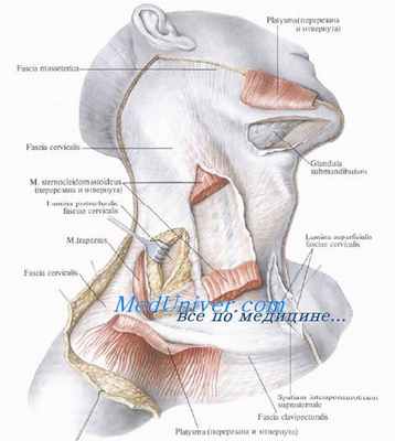 Помимо жировой клетчатки в наружном шейном пространстве содержатся кровеносные и лимфатические сосуды, нервы, лимфатические узлы.
