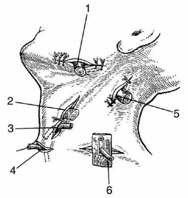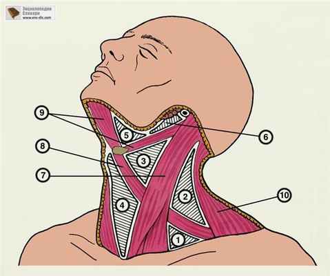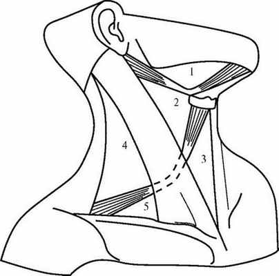 1 - поднижнечелюстной; 2 - сонный; 3 - лопаточно-трахейный; 4 - лопаточно-трапециевидный; 5 - лопаточно-ключичный