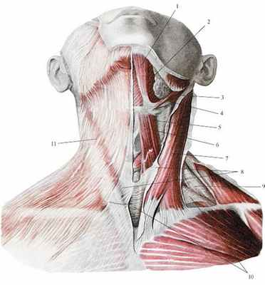 1 - переднее брюшко двубрюшной мышцы, 2 - челюстно-подъязычная мышца, 3 - шило-подъязычная мышца, 4 - заднее брюшко двубрюшной мышцы, 5 - лопаточно-подъязычная мышца (верхнее брюшко), 6 - грудино-подъязычная мышца, 7 - грудино-ключично-сосцевидная мышца, 8 - поверхностная пластинка шейной фасции, 9 - предпозвоночная пластинка шейной фасции, 10 - предтрахеальная пластинка шейной фасции, 11 - подкожная мышца шеи.