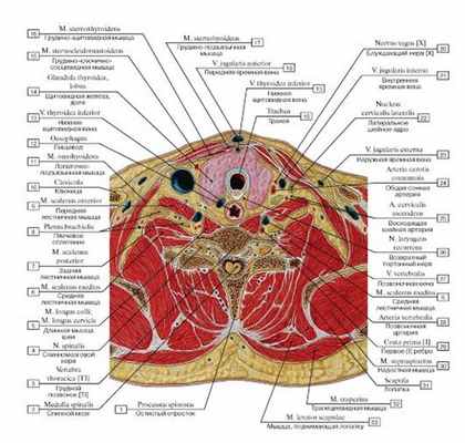 1 - Spinous process; 2 - Spinal cord; 3 - Thoracic vertebra [TI]; 4 - Spinal nerve; 5 - Longus colli; 6 - Scalenus medius; Middle scalene; 7 - Scalenus posterior; Posterior scalene; 8 - Brachial plexus; 9 - Scalenus anterior; Anterior scalene; 10 - Clavicle; 11 - Omohyoid; 12 - Oesophagus; 13 - Inferior thyroid vein; 14 - Thyroid gland, lobe; 15 - Sternocleidomastoid; 16 - Sternothyroid; 17 - Sternohyoid; 18 - Anterior jugular vein; 19 - Trachea; 20 - Vagus nerve [X]; 21 - Internal jugular vein; 22 - Lateral cervical nucleus; 23 - External jugular vein; 24 - Common carotid artery; 25 - Ascending cervical artery; 26 - Recurrent laryngeal nerve; 27 - Vertebral vein; 28 - Vertebral artery; 29 - First rib [I]; 30 - Supraspinatus; 31 - Scapula; 32 - Trapezius; 33 - Levator scapulae