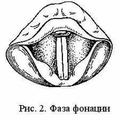 В фазе выдоха голосовые складки несколько сближаются, однако при этом не замыкают полностью просвет гортани. В момент фонации, т. е. воспроизведения звука, голосовые складки начинают колебаться, пропуская порции воздуха из легких. При обычном осмотре они кажутся сомкнутыми, так как глаз не улавливает скорости колебательных движений (рис. 2).