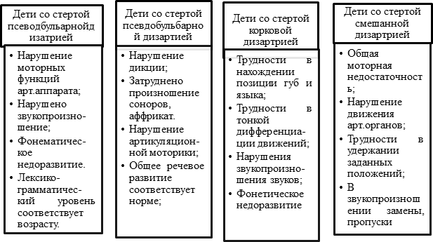 Исследователи О. И. Мартынова, Л. В. Мелехова, С. И. Маевская констатируют, что у детей со стертой дизартрией имеются нарушения фонетической стороны речи и недоразвитие лексики [15].