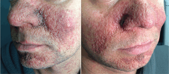 В 1995 г. пациент впервые заметил высыпания в области локтей, сопровождающиеся умеренным зудом. Врачом КВД по месту жительства был поставлен диагноз: псориаз. Отмечено относительно спокойное течение заболевания с редкими обострениями. В то же время на коже лица продолжали появляться новые мелкие узелковые высыпания.