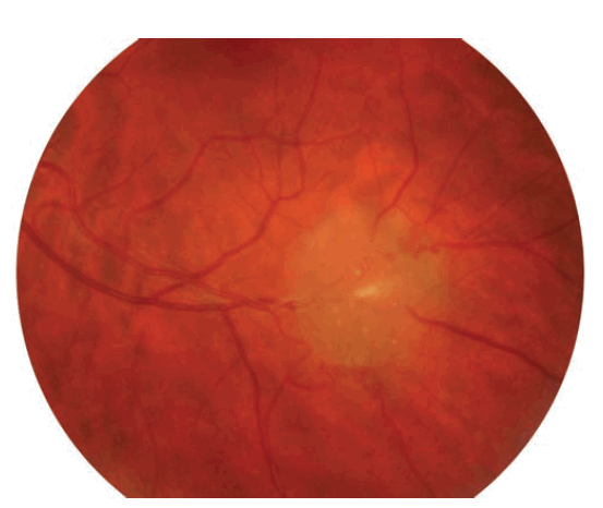 Рис. 2. Фотография глазного дна: крупный проминирующий очаг желтоватого цвета с чёткими контурами