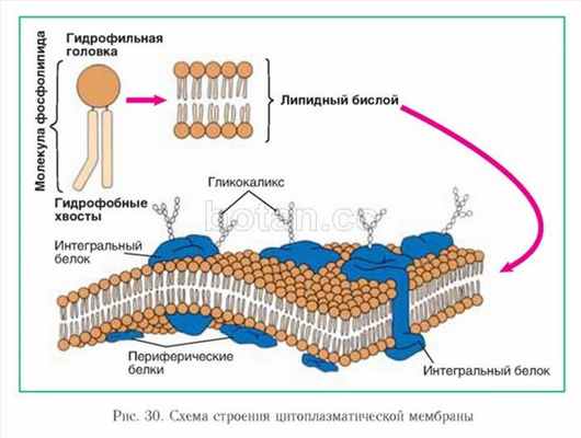 Молекулы фосфолипидов располагаются в виде двойного слоя (липидный бислой). Как вы уже знаете, каждая молекула фосфолипида образована полярной гидрофильной головкой и неполярными гидрофобными хвостами. В цитоплазматической мембране гидрофильные головки обращены к наружной и внутренней сторонам мембраны, а гидрофобные хвосты — внутрь мембраны (рис. 30).