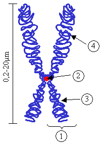(1) Хроматида . Каждая из них образована цепочкой родительской ДНК и цепочкой вновь образованной ДНК, полученной после репликации во время S-фазы; (2) Центромера. Точка контакта двух хроматид и точка разделения во время митоза; (3) короткое плечо; (4) Длинная рука