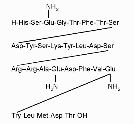 Глюкагон*- 29-членный одноцепочечный полипептид (мол. масса 3485), состоящий из 29 аминокислотных остатков. Он образуется в альфа-клетках островкового аппарата поджелудочной железы, а также в желудочно-кишечном тракте и выполняет важную роль прежде всего в регуляции углеводного обмена и жирового обмена.