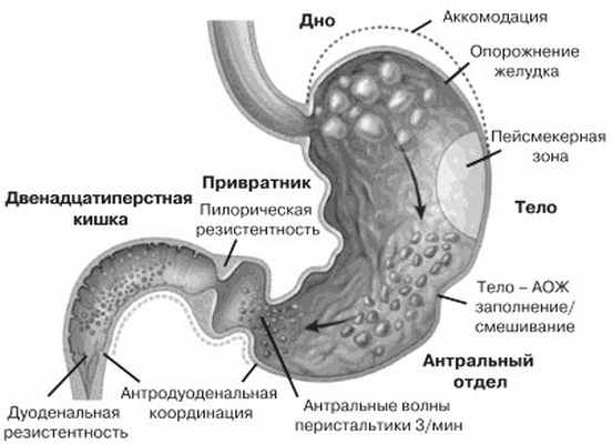 - моторная — обеспечивает депонирование пищи в желудке, ее механическую обработку и эвакуацию содержимого желудка в кишечник;