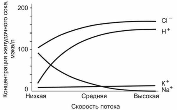 Желудочный сок — прозрачная жидкость, состоящая из воды и плотных веществ (0,5-1,0%). Плотный остаток представлен неорганическими и органическими компонентами. Среди анионов преобладают хлориды, меньше фосфатов, сульфатов, гидрокарбонатов. Из катионов больше Na+ и К+, меньше Mg 2+ и Са 2+ Осмотическое давление сока больше, чем плазмы крови. Основной неорганический компонент сока — соляная кислота (НСI). Чем больше скорость секреции НСI обкладочными клетками, тем выше кислотность желудочного сока (рис. 1).