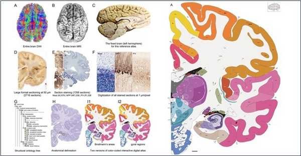 Для составления атласа пришлось задействовать магнитно-резонансную томографию, диффузионно-взвешенную визуализацию (диффузионную МРТ) и 1356 больших анатомических пластин размером с полушарие мозга для иммуногистохимии (ИГХ) и исследования по методу Ниссля с клеточным разрешением, то есть 1 мкм/пиксель.