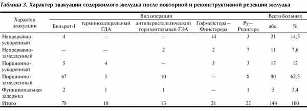 По данным рентгеноскопии и НЭГИГ, тонус культи желудка восстанавливается в сроки до 1 года после операции в виде ритмичных перистальтических сокращений, эвакуация порционная. Моторная функция отводящей петли восстанавливается в течение 1 мес (периодические перистальтические сокращения). Характер эвакуации содержимого желудка при различных вариантах восстановления непрерывности желудочно-кишечного тракта после повторной и реконструктивной резекции желудка представлен в табл. 3.