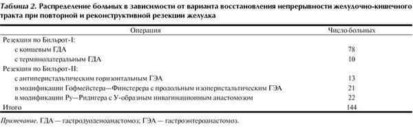 Распределение больных в зависимости от варианта восстановления непрерывности пищеварительного тракта при повторной и реконструктивной резекции желудка представлено в табл. 2.