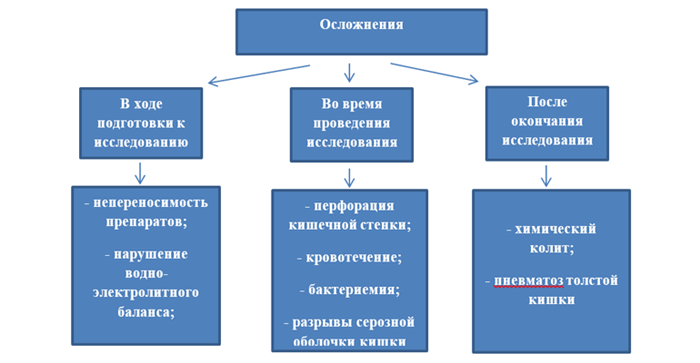Большинство осложнений, возникающих в процессе подготовки кишечника к исследованию незначительны и включают в себя тошноту, рвоту, вздутие живота, недомогание. При приёме препаратов стимулирующего и осмотического действия могут наступить нарушения водно-электролитного баланса. В тяжелых случаях развивается гиповолемия, дегидратация и гипокалиемия. Было замечено, что гипокалиемия чаще возникала у пациентов, принимающих диуретики, в частности тиазидные. Это следует учитывать при подборе препарата для подготовки к исследованию [3].