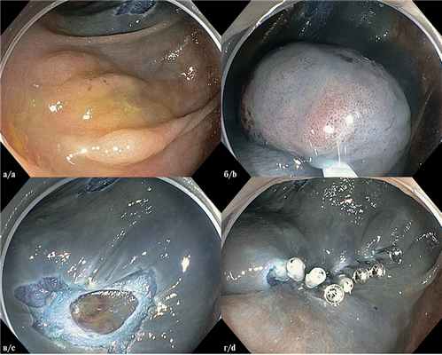 а — эпителиальное образование в виде поверхностно распространяющейся опухоли; б — после подслизистого лифтинга образование захвачено петлей; в — рана после удаления образования с перфорационным отверстием; г — рана ушита клипсами.