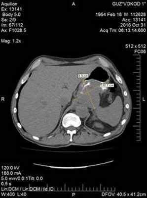 Пациент С., 64 лет, и.б. №112628, поступил в хирургическое отделение №5 Волгоградского областного клинического онкологического диспансера 27.10.2016 г. При поступлении предъявлял жалобы на общую слабость, боли в эпигастральной области и левом подреберье, наличие в анамнезе черного стула. При поступлении состояние расценено как относительно удовлетворительное. Нормостеничного сложения. Кожные покровы обычной окраски. В общем анализе крови отмечается умеренная анемия со снижение Hb до 103г/л, эритроцитов 3,8х10 12 , лейкоцитов 6,3х10 9 , лейкоцитарная формула в пределах физиологической нормы, СОЭ 45 мм/ч. Креатинин 87,9 мкмоль/л, билирубин 6,3 мкмоль/л, глюкоза крови 4,7 ммоль/л.