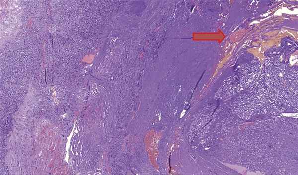 Рис. 6. Гемангиобластома и прилежащий нервный стволик (указан стрелкой), Окраска гематоксилином и эозином, ув. ×50.