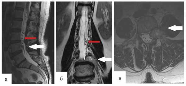Рис. 1. Гемангиобластома корешка L4. На серии МРТ, выполненных в сагиттальной, фронтальной и аксиальной проекциях в режиме T2 (а, б, в), определяется экстрадурально расположенное гипоинтенсивное объемное образование на уровне L4—L5 позвонков с гиперинтенсивными очагами и паравертебральным ростом влево по типу «песочных часов» (опухоль указана белыми стрелками). В сагиттальной и фронтальной проекциях (а, б) обращает на себя внимание выраженная сосудистая сеть (указана красными стрелками), которой в Т2-режиме соответствуют множественные зоны гипоинтенсивного сигнала.