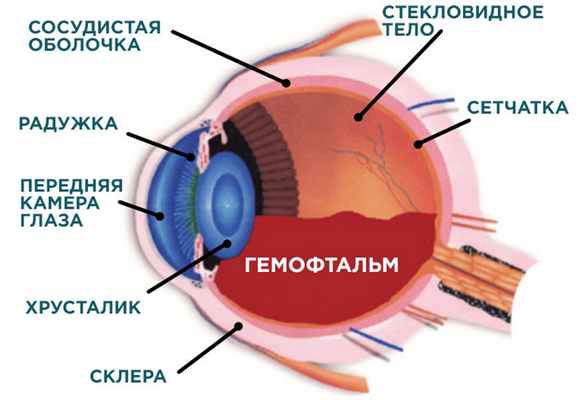 Гемофтальм — это попадание крови в стекловидное тело — гелеобразную структуру, заполняющую полость глазного яблока.