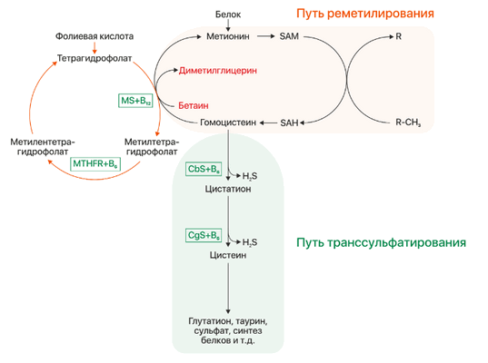 Бетаин наряду с метилтетрагидрофолатом (см. рис. 1) является донором метильной группы для гомоцистеина. Его прием при B6-резистентной форме гомоцистинурии обеспечивает альтернативный путь синтеза метионина и уменьшает уровень гомоцистеина в крови.